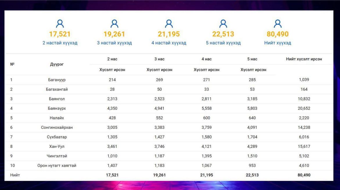 Цэцэрлэгийн бүртгэл үргэлжилж байна by superadmin 2025-08-08 2025-08-08 199 Нийслэлийн хүүхдийн цэцэрлэгийн бүртгэлийн системд өнөөдрийн 17:00 цагийн байдлаар 80,490 эцэг эх, асран хамгаалагч хандаж, хүүхдийнхээ цахим бүртгэлийг баталгаажуулжээ. Share 0 FacebookTwitter