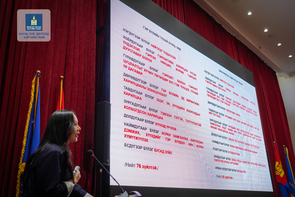 Гэр бүлийн тухай хууль /шинэчилсэн найруулга/-ын төсөл, Гэр бүлийн хэрэг шүүхэд хянан шийдвэрлэх тухай хуулийн төслүүдийн гол үзэл баримтлалыг танилцуулах хэлэлцүүлгийг өнөөдөр /2025.09.29/ зохион байгууллаа.