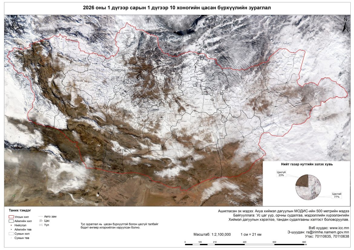 2026 оны 1 дүгээр сарын 10-ны өдрийн байдлаар Монгол орны нийт нутгийн 77 хувьд цасан бүрхүүлтэй байна. Цасны зузаан хамгийн их байгаа сумдыг дурьдвал Увсын Ховд, Цагаанхайрхан, Завханы Цэцэн-Уул, Баянтэс, Хөвсгөлийн Цэцэрлэг, Сэлэнгийн Ерөө, Орхонтуул, Орхон, Хушаатад 31-40 см байна.