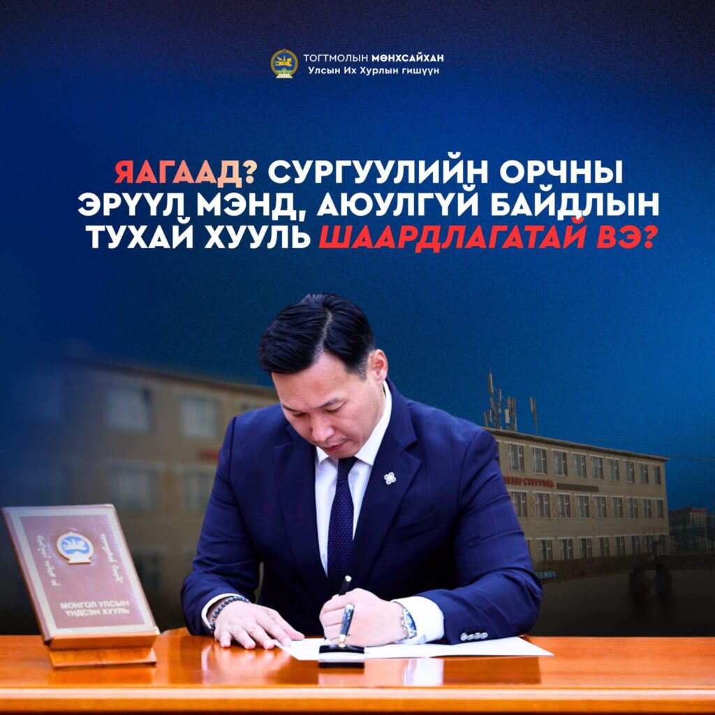 УИХ-ын гишүүн Т.Мөнхсайхан УИХ-д Сургуулийн орчны эрүүл мэнд, аюулгүй байдлын тухай хуулийн төслийг 2025 оны арванхоёрдугаар сард өргөн мэдүүлсэн. Хуулийн төсөлд эрүүл мэндийн баг ажиллуулах талаар тусгасан нь суралцагчдын бие, сэтгэл зүй, нийгмийн аюулгүй байдлыг цогцоор нь хамгаалах чухал бодлогын алхам болсныг хууль санаачлагч тодотголоо.